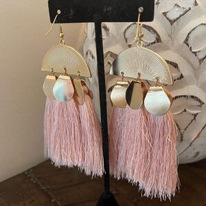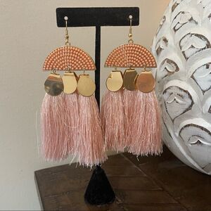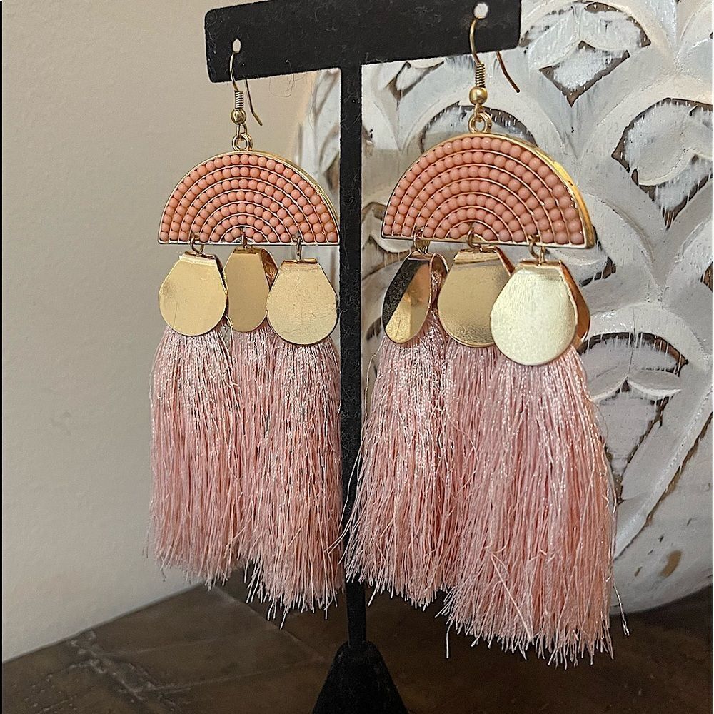 Measures 3.5”’long, with 3 individual tassels, these statement earrings add a pop of color without weighing you down. They are not too heavy, but also not so lightweight that they get stuck in your hair or fall out. The gold-plated metal tassel “covers,” as well as the peach and golden half circle tile design give these earrings the added weight and depth they need to make them “just right.”