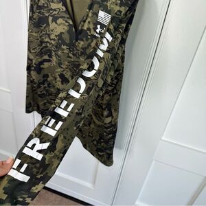 Large Under Armour Freedom Tech 1/2 Zip. Stand collar with front half-zip closure. Long sleeve design. UA Tech fabric is quick-drying, ultra-soft and has a more natural feel. Material wicks sweat and dries really fast. Loose fit offers a fuller cut for complete comfort. Graphic screen print on front upper-left and left sleeve. Straight hemline. 100% polyester. Machine wash, tumble dry.