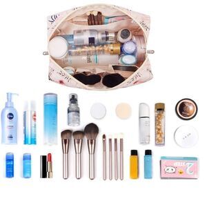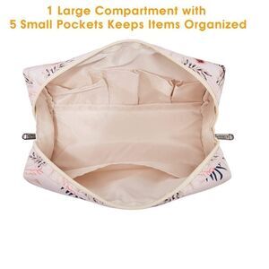 Perfect cosmetic bag that’s lightweight, and perfect for travel. One main compartment with 5 small pockets neatly organizes your makeup. One large compartment easily holds travel-size toiletries or large skin-care products. Side pockets holds your concealer, lipsticks or other small items.