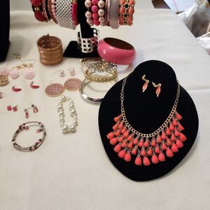 Large lot of pink mixed costume jewelry some new some vintage all in good wearable condition may be missing earring backs