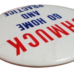 Vintage Shmuck Go Home and Practice button pinback pin 3.5". Rare pinback funny pin. Some discoloration and rust spots on back due to age.