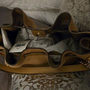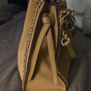 Large suede Mina Michael khors bag with gold chains and leather straps.