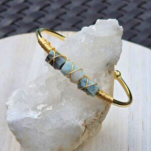 Larimar 3-Stone Wire Wrap Cuff โ 14Kt Gold Over Copper โ Ocean Calm Talisman