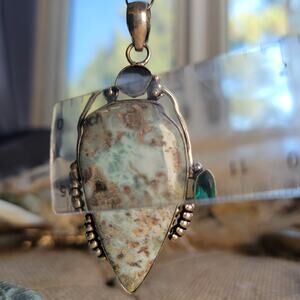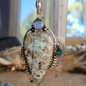 This stunning larimar pendant captures the serene beauty of ocean waves, with its soothing blue hues and unique marbling. Set in solid sterling silver, this 2.5 x 1.5-inch pendant is accented with a faceted blue topaz stone, adding a touch of sparkle. The 20-inch sterling silver chain completes this elegant look, making it perfect for everyday wear or special occasions. Larimar, often called the Stone of Atlantis, is believed to promote tranquility, clarity, and emotional healing. Its naturally calming colors make it a perfect boho statement necklace for those who love ocean-inspired jewelry. Whether you're drawn to the sea, love nature-inspired designs, or simply want a unique artisan pendant, this piece is a timeless and meaningful addition to any collection. An ideal gift for her, whether for birthdays, holidays, or as a special keepsake.
