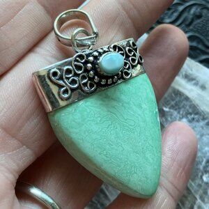 Pendant of a natural variscite crystal stone in a 925 silver plated setting with swirls and an inset larimar gem.