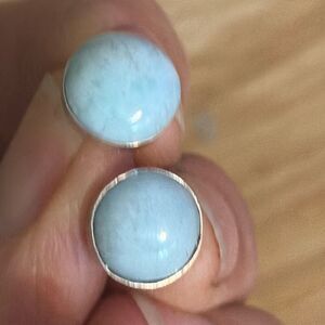 Larimar and Sterling Silver Earrings, Post, NEW, 10 mm Round, Handmade, Artisan. These glorious rounds of blue Larimar reflect the Caribbean location it comes from: The Dominican Republic. The blue from the Caribbean Sky and the Green from the Caribbean Sea, these stones are smoothly cut in a cabochon shape, then set in simple bezel settings to showcase the hero of the piece: the Larimar. New from my studio in Florida. Made in the USA.