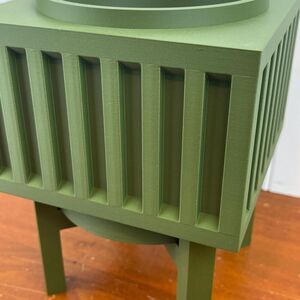 The planter is 3D printed using eco-friendly, biodegradable PLA plastic filament. 3D printing is done by printing layer upon layer of filament to build up and create the print.