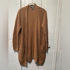 Lark & Grey Waffle textured long open cardigan with front pockets in a neutral light terra cotta colored in size large in excellent condition. Armpit to armpit is approximately 22” flat and length shoulder to hem is approximately 35”.