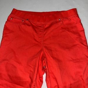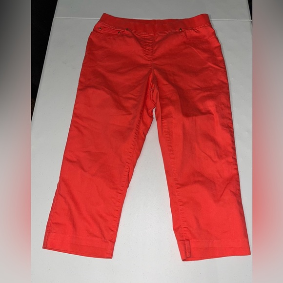 Capri are by Lark Lane, coral reddish orange, 3 front pockets, 2 back pockets, elastic waistband, ladies size 12 & EUC.