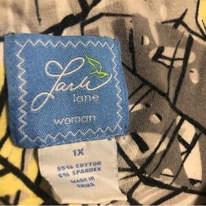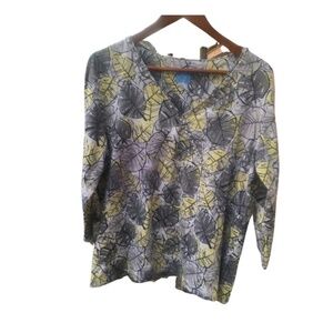 Beautiful Lark Lane Woman top featuring an eye-catching gray and yellow leaf print and a flattering V-neckline with beaded accents. Soft cotton-spandex blend offers stretch and comfort.