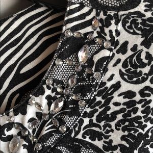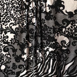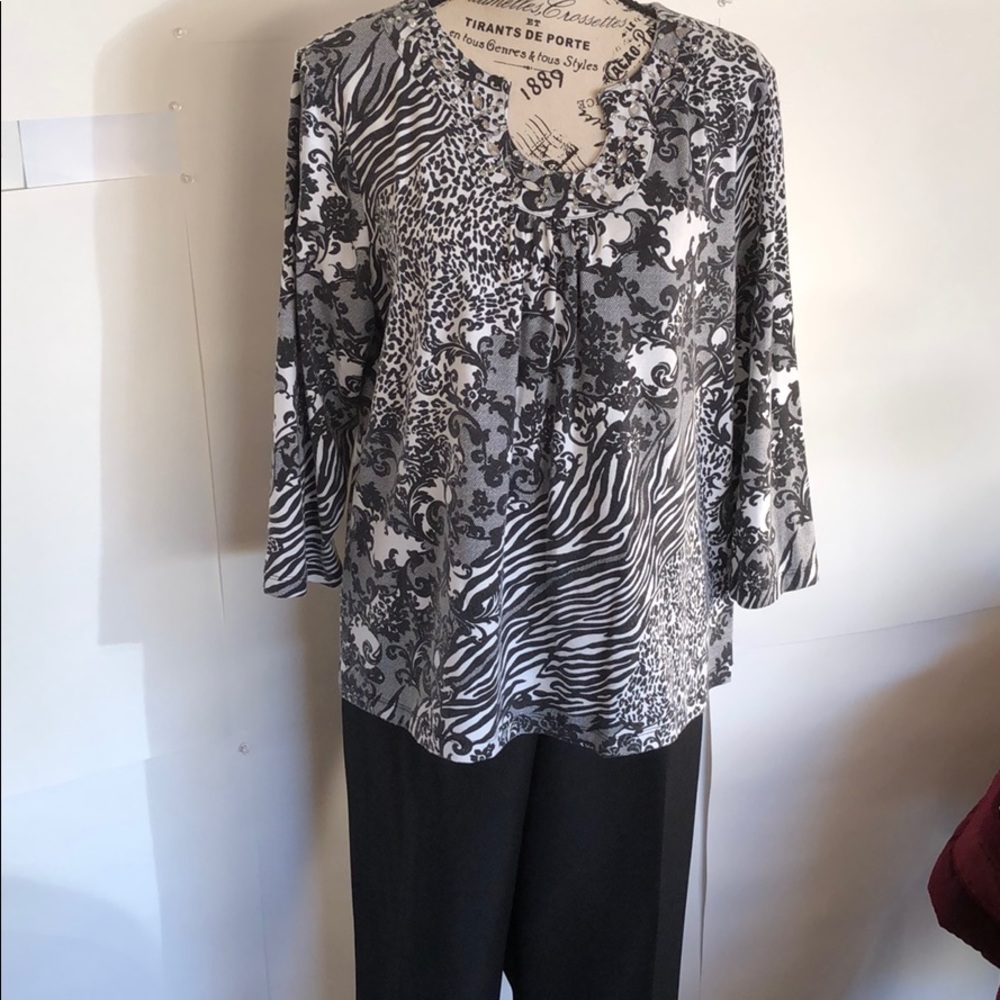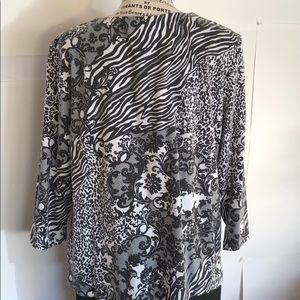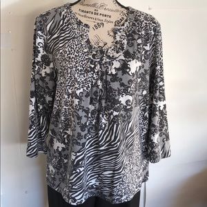 Black and white it is 62% polyester 33% rayon and 5% spandex and it’s a size large. This top is back and white with lots of prints and patterns. Including some animal print in it.