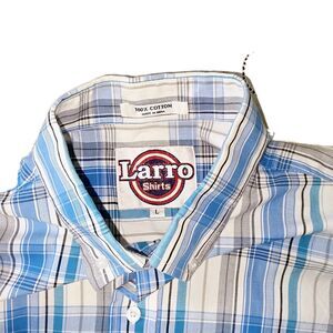 The Larro Shirts Western Plaid Shirt in size L is a stylish and versatile button-up shirt suitable for various occasions. Featuring a classic blue and orange plaid pattern, this shirt is made of comfortable cotton knit fabric with a regular fit. The collared neckline and short sleeves add a touch of sophistication, while the logo accents provide a personalized flair. Perfect for casual outings, parties, or business settings, this easy-care shirt is a wardrobe essential for all seasons.