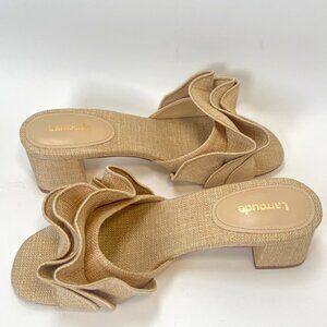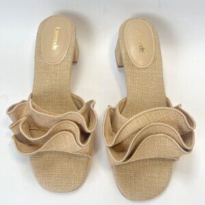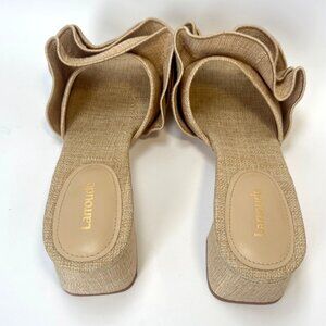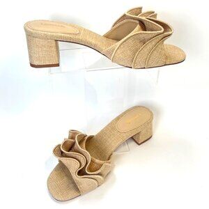Larroudé Brigitte Beige Sandals Ruffle Raffia Block Heel Mules Size 9.5