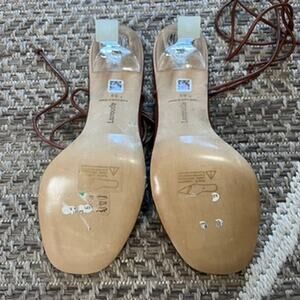 Larroudé Gloria Sandal In Caramel Leather and Vinyl Sz 8.5