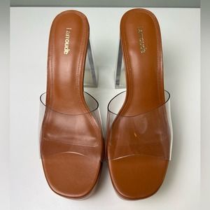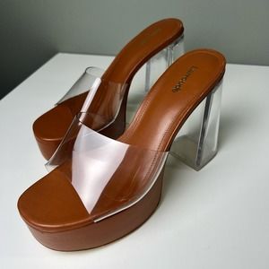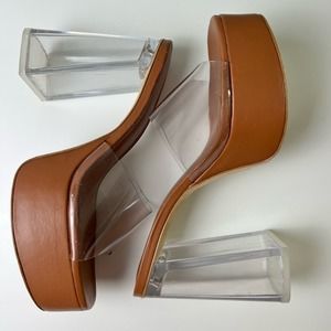 Larroude Dolly Lucite Vinyl Platform Mules Clear Caramel 8