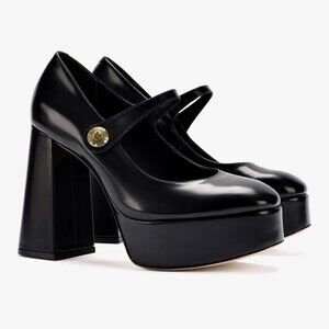 A reimagining of the mary jane we can't get enough of, this new sky-high version has an unmistakeable flair. With a comfortable pitch and platform base in an enduringly classic black leather, you can wear her everywhere. 4.5 inch block heel. 1.6 inch platform. Size 8. New without box! No flaws. Plastic protection sticker still on soles.