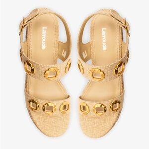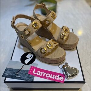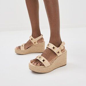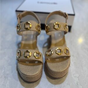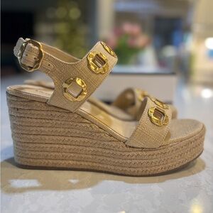 New with Box. Based on our enduring bestseller, we've reimagined our Milan sandal as an espadrille for Summer fun. With a stable woven base, this one offers the iconic hardware and soft caramel leather that makes her a Summer must-have.