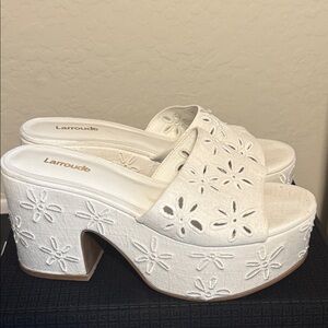 Larroude Miso Platform Sandal Linen Daisy White Slide Heel Size 7.5