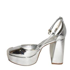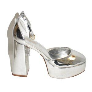 Shiny silver platform shoes with ankle strap. Chunky heel design. Elegant and bold. True to size.