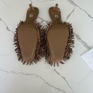 Stylish tan mules with fringe detail. Perfect for a trendy look.