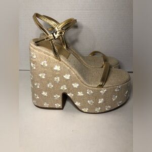 Chic platform sandals with gold straps. Cream base with floral accents. Perfect for stylish outings.