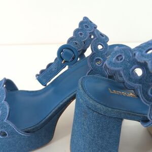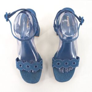 Details: Larroude Women 11 Dolly Broderie Sandal Blue Stoned Denim Platform Ankle Strap