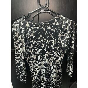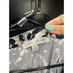 Stylish Larry Levine blouse featuring a bold black and white abstract print, faux wrap V-neckline, and flattering ruched side detail. Soft, stretchy fabric makes it comfortable yet polished — perfect for office wear, casual outings, or dinner dates.