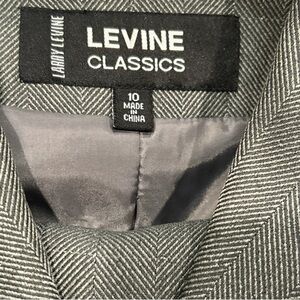 Larry Levine Classics (Gray with silver threading throughout) 2 Piece skirt set EUC size 10. The jacket is double breasted with notched collar. The skirt zips in the back, has small pleats at the hemline is fully lined.