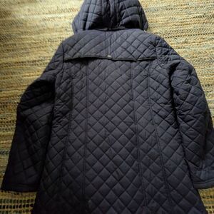 Stay cozy and classic in this rich eggplant purple Larry Levine quilted puffer coat, perfect for chilly days and cold commutes. This long sleeve coat features a diamond-quilted shell with snap and zip front closures, front flap pockets with snap buttons, and a roomy detachable hood for extra warmth. Fully lined and lightly padded for insulation, this coat blends practicality with timeless cold-weather style. Great for layering and everyday wear.