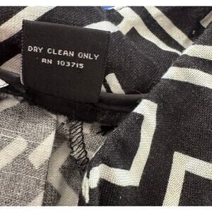 This Larry Levine skirt is in excellent pre-owned condition, showing no stains, tears, or flaws. It features a unique black and white geometric pattern on a comfortable linen blend fabric. Perfect for adding a touch of sophistication to any outfit!