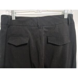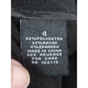 Classic pair of dress pants from Larry Levine stretch in size 4. Made from polyester, rayon, and spandex these pants are a nice dark solid black. They have a zip close with a hidden double set of hook and eyes at the waist as well as a hidden button. They feature two slit pockets one on either hip and two faux pockets on the back. These are mid-rise pants the exact rise is nine and a half inches. The waist measurement is about 30 to inches. The inseam is 31 in and the leg opening is about 11 in.
