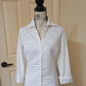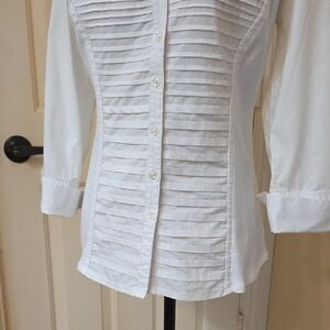 Chic white button-down shirt by Larry Levine. Features pleated front and classic collar. Ideal for both casual and formal settings.