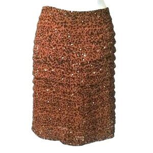 animal print skirt, layered ruffle skirt, size 16 skirt, brown black skirt, polyester skirt, Larry Levine skirt, pleated design skirt, side zip skirt, fully lined skirt, leopard print skirt, chic office wear, stylish midi skirt, women's fashion skirt