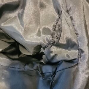 Vintage Larry Levine 100% wool double-breasted peacoat with a notched collar, hand pockets, and a straight silhouette. Good pre-owned condition with some signs of wear, including some loose stitches in the lining under arm, holes in the right pocket, and markings on the brand label.