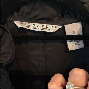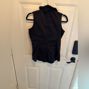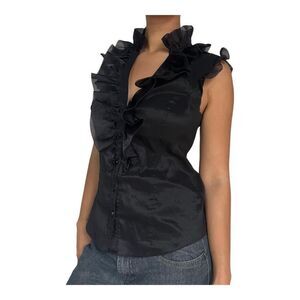 This sleeveless black blouse by Larry Levine features elegant ruffled details along the neckline and front, creating a sophisticated look. The fitted design and buttoned closure add a touch of structure, making it a versatile choice for formal occasions.