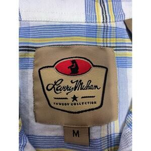 Add some western flair to your wardrobe with this Larry Mahan Cowboy Collection men's button-up shirt. Featuring a blue and white plaid pattern with a collared neckline and button-down closure, this shirt is perfect for any occasion, whether it be a casual day out or a business meeting. Made with easy-care cotton material, this shirt is machine washable and suitable for all seasons. It also comes with pockets for added convenience. The long-sleeved shirt has a regular fit and is available in size M. The shirt is accented with the Larry Mahan Cowboy Collection logo and is part of the product line. It is a great addition to any cowboy or western-themed outfit.