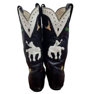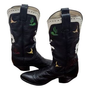 Larry Mahan Rare Rodeo Cowgirl Western Boots & Cactus and Horse Design Stylish cowboy boots with unique cactus and horse design. Perfect for adding a western flair to any outfit. Spectacular Vintage LARRY MAHAN Rodeo Buckin Bronco Cactus Longhorn Steer Head Inlay Overlay Rockabilly Cowgirl Cowboy Western Boots. Handmade in Texas, USA 100% Genuine Leather Upper, Lining & Soles. Tall Mid-Calf Height Pointed Snip Toe. Black • White • Red • Yellow • Green These are vintage Larry Mahan cowboy boots. Larry Mahan was a world champion rodeo rider who later designed a line of cowboy boots. These boots often feature intricate designs and high-quality materials. In great condition.