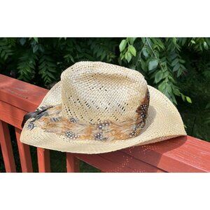 Larry Mahan Vintage Western Braided Straw Hat With Feathers Size 7