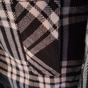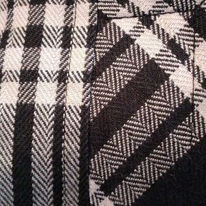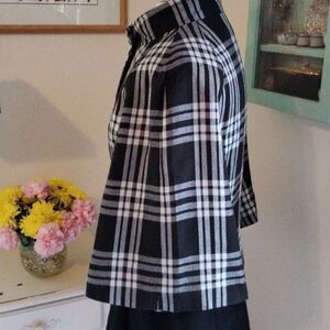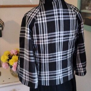 This is the best jacket, a statement in itself. Black and white plaid. Pewter colored buttons Stand up collar. Fully lined. The best part are the butterfly sleeves, so pretty! Size 10 measures 39 at chest, 36 at waist, 39 at bottom hem. 21 long from shoulder to hem. Sleeves 18. Seaming for a perfect fit. Beautifully made, all the plaids match. You'll love this one.