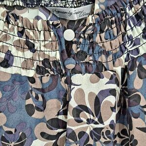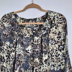 Beautiful pullover Blouse! Like new condition. Gray, taupe and tan, size SP. Boat neckline has smocking all the way around, keyhole, 2 button front. 3/4 sleeves. Banded bottom with side tie sash. Gorgeous over a turtleneck or tank! Semi sheer. Measures 20.5" pit to pit, length is 25". 100% polyester.