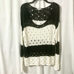 Larsen Gray. Size women's XL. Open knit, distressed, scoop neck, long sleeve black and white striped sweater top. The perfect layering piece for fashion-forward urban style, this open knit sweater will enhance any ensemble with an edgy twist. Great for the change of the seasons. In preloved condition, no visible flaws (see photos for condition, if applicable); as with any preowned clothes, you should wash before wearing the first time. Made of 60% cotton, 40% rayon. From a pet friendly home.