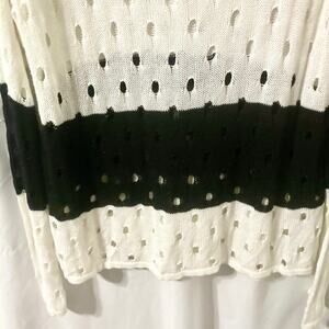 Larsen Gray. Size women's XL. Open knit, distressed, scoop neck, long sleeve black and white striped sweater top. The perfect layering piece for fashion-forward urban style, this open knit sweater will enhance any ensemble with an edgy twist. Great for the change of the seasons. In preloved condition, no visible flaws (see photos for condition, if applicable); as with any preowned clothes, you should wash before wearing the first time. Made of 60% cotton, 40% rayon. From a pet friendly home.