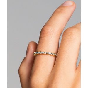 Lilja meaning Lily, the sweet and innocent flower associated with fresh life is the perfect representation for this unusual piece. The subtlety of a simple band with the bold and beautiful edge of blue crystals set all the way around, as the blooms do your mood, uplift your outfit with the Lilja Ring. Material: 18ct Gold Plated Sterling Silver.