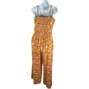 Larsyn & Lily Floral Burnt Orange Jumpsuit Smock Back Deep V-Neck With Twist Not & Key Hole on Chest Size Large Wide Leg