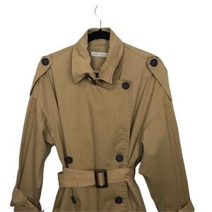 Tan / beige, double breasted, belted trench coat. One size. Preowned with small discoloration near pocket. Otherwise in good shape.