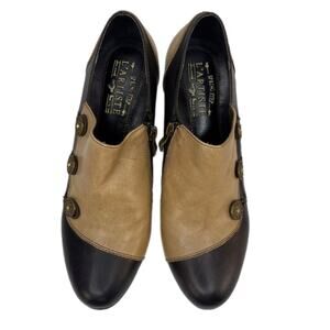 The earthy tan and brown palette showcases hand-burnished details and the brand's signature artistic flair, with a comfortable low heel for all-day wear.