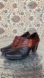 These heels feature a striking two-tone design with polished black and brown leather, offering a vintage-inspired look. The moderate 2-3 inch heel and rounded toe provide a blend of comfort and style, making them perfect for professional settings. Intricate stitching details enhance their sophisticated appeal.