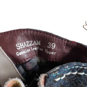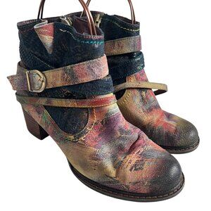 L'artiste by Spring Step Shazzam boots, distressed multicolor leather and fabric upper, snake embossed, criss cross straps and buckles, round toe, block heel, rubber soles, side zipper, EU 39 / US women's 8.5, preowned and shows wear on the soles, creasing, small flaw on the heels - see photos
