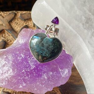 Larvikite black Moonstone & Amethyst Solid Sterling Silver Heart Pendant
