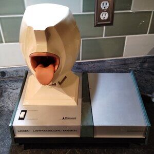 Interesting conversation piece, for learning or unique vintage decor. Sherwood Medical Industries started creating these Laryngoscopic Mankins in 1967. This looks to be in great condition; the power cord is intact and the light works (pictured). The drawer houses transparency slides to insert for viewing without the gagging of a human subject. Slides are labeled and numbered.